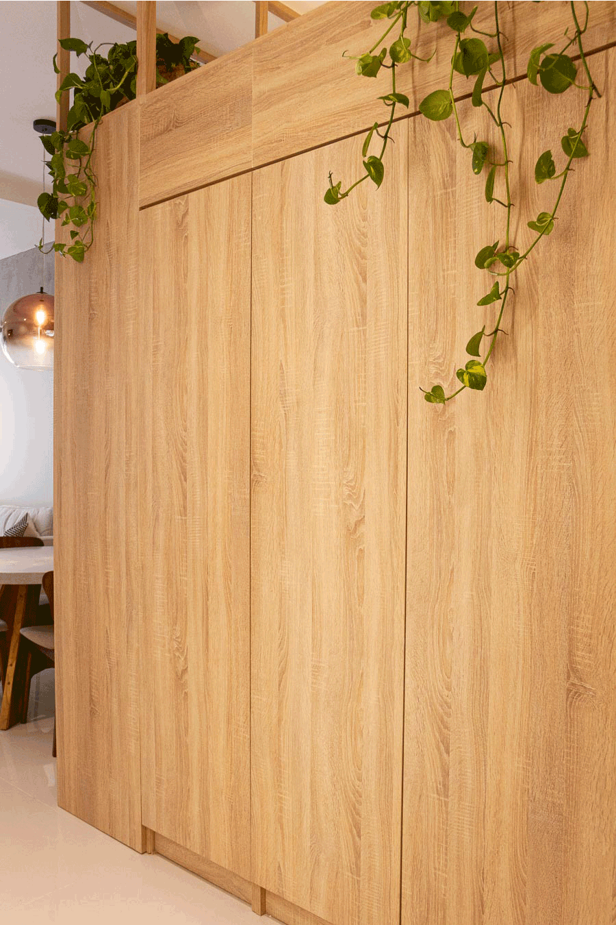 Este módulo tiene varias funciones que permiten mantener una fluidez entre las diferentes áreas de la vivienda: almacenaje, espacio de trabajo, banco de asiento con zapatera para la entrada y minibar para el área de comedor. Gracias a su diseño abierto en la parte superior, permite la circulación de aire e iluminación natural.