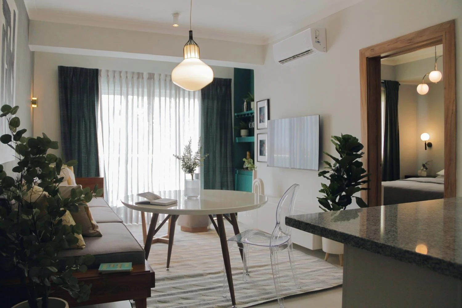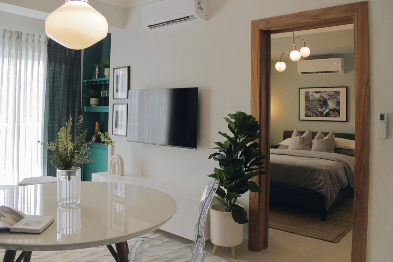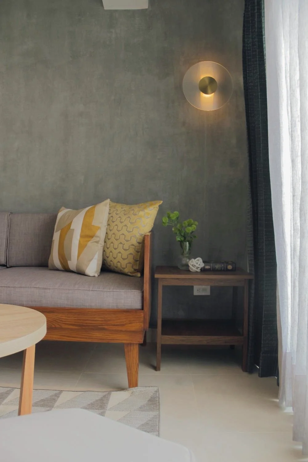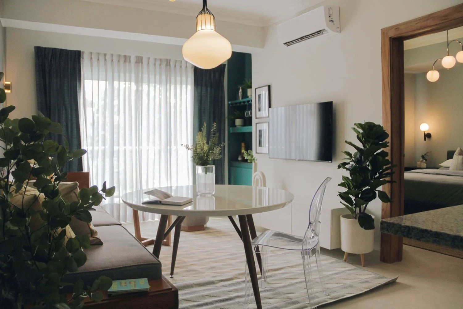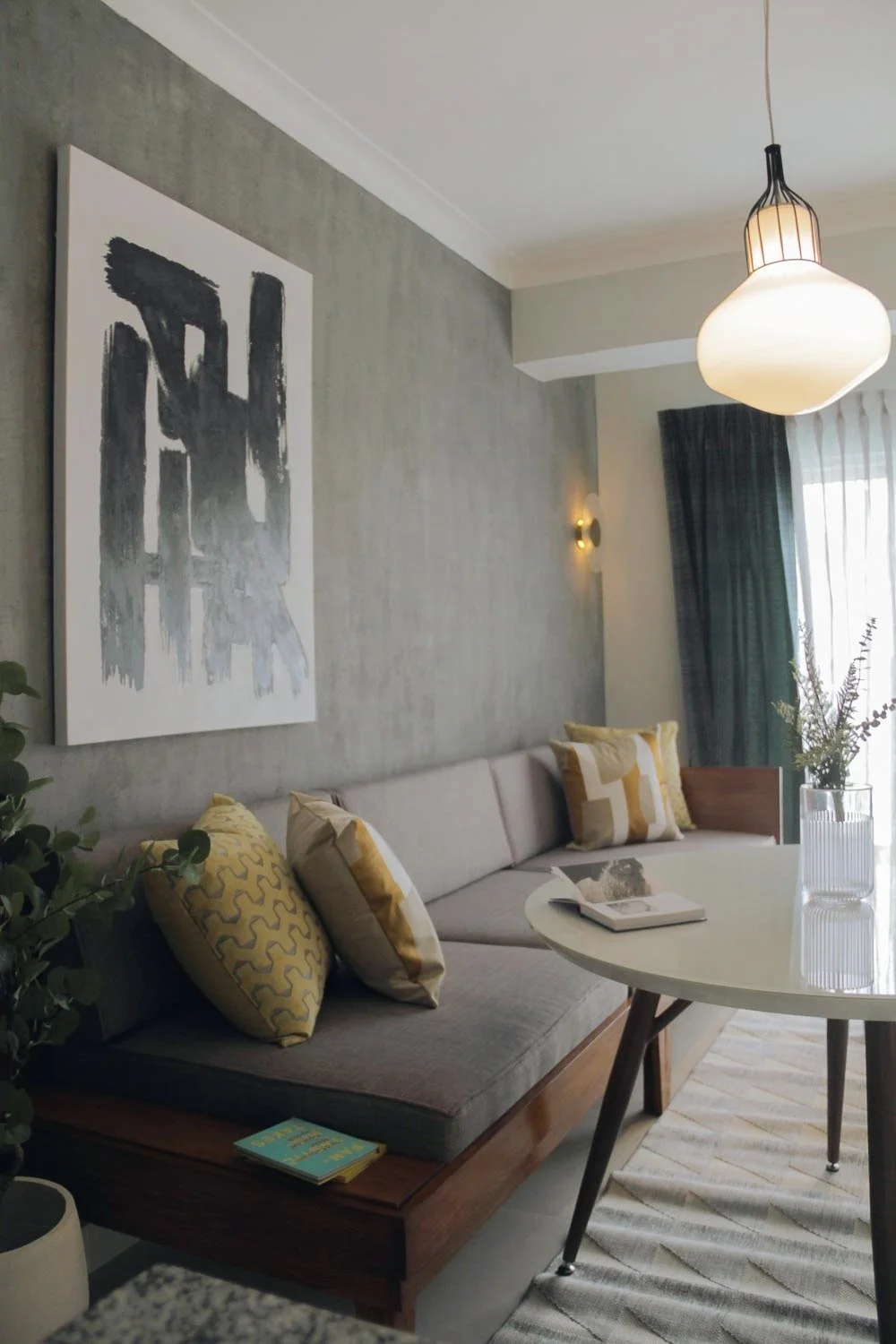 Apartamento diseñado para uso de alquiler de corta duración. Los espacios reducidos para este tipo de vivienda ameritan un mobiliario multifuncional. Con el diseño de un sofá a medida inspirado en el estilo mid-century modern, logramos aprovechar el espacio sirviendo como cama secundaria, banco de apoyo para la mesa de comedor y asientos para varias personas a la vez.