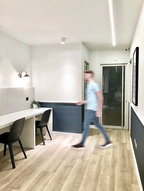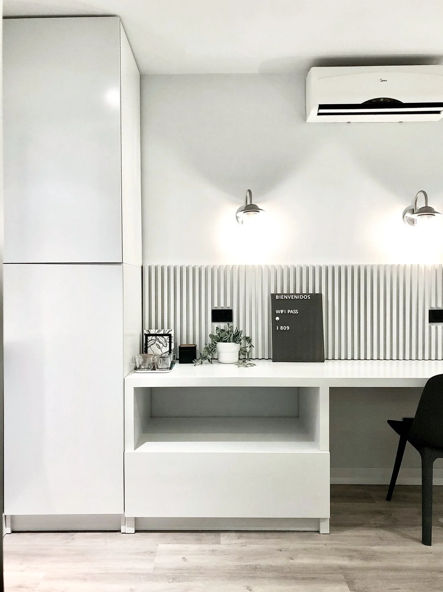 Este espacio forma parte del área de transición entre oficinas privadas y sala de reuniones. Se aprovechó para crear un área de trabajo para el equipo rotativo y también como zona de reuniones virtuales. Cuenta con almacenaje oculto para material gastable y zona de refrigerio.